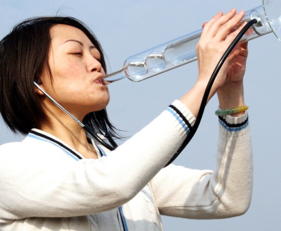 A hollow glass with a small glass pipe makes the drinking of the water possible to play with air bubbles while looking through it and deforms your vision like the surface of water when deeply immerged.